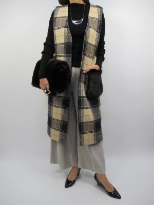 大きなチェック柄のツイードで ジレとして着用するワンピースです。 ワイドパンツにさっと羽織るとオシャレ。 ニットを黒で絞めてコンパクトに見せるのもコツ。 ポケットのボアの黒にリンクしてコーデしました!