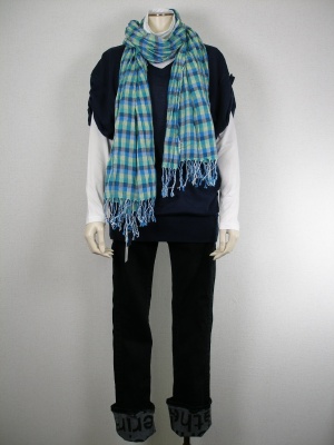タポッとしたシルエットの綿ニット。休日ファッションは、楽チンがキーワード。ストールをするとそのまま近所のスーパーにお出かけできますね!アクティブ度100%。