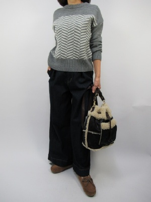 ボトムスが太目になっているデザインはトップスでカバー。 短丈のニットはウエストあたりまでの丈感でボトムスのバランスがとれて コンパクトにまとまるので とてもバランスがよくスタイルよくまとまるのが良い。 スニーカーもフラットな靴をはいてもオシャレです!