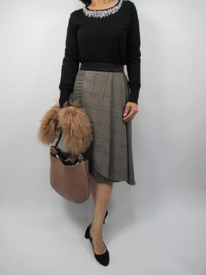 年末にかけてお呼ばれなどの席が多くなりますね。 ニットもパールのビジュー付で 胸元が華やかな装いに。 スカートはチェック柄と千鳥の組み合わせが オシャレな変形スカートで インパクトをつけて華やかさをプラス!