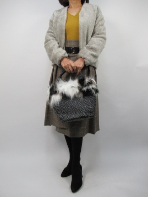 ラップ風のチェック柄スカートの生地の中の 黄色にリンクしてトップスを黄色のニットでコーデ。 あえてショート丈のモコモコブルゾンを用いて スカートのチェック柄を活かしました。 繋ぎは黒タイツで足元を引き締めて!