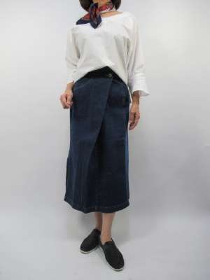 タイトなデニムスカートをすっきりと白のブラウスで合わせてみました。Vネックのすっきりしたデザインなのでネックにプチスカーフでアクセントを出しました。スカートの丈はミモレ丈でフロントにワンタック入っているのでおなか回りもすっきり見せてくれます!