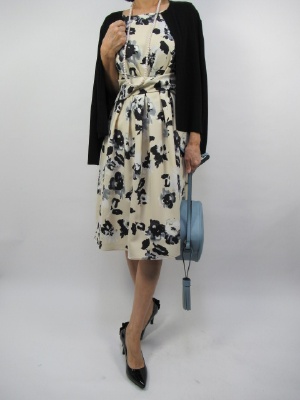 ウエスト切り替えの甘口エレガントワンピースは上品なベージュ色をチョイスすると幅広いシーンに。上に合わせる物次第で着こなしが楽しめます。シンプルな短丈カーデを羽織ってご主人との外でのお食事に!