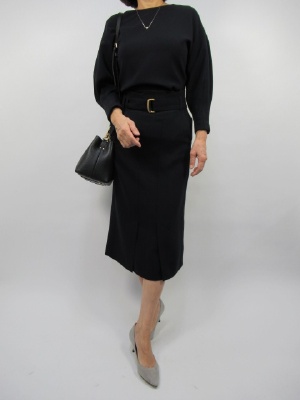 イプセの大人気商品のセットアップをご紹介します。スカートはやや長めのタイトスカート。共布ベルトつきです。トップスのブラウスは袖口が少し細めのシルエットになっていて、袖筒はふんわりしているのでメリハリのあるデザインが女性らしさをグッと引き出してくれます!