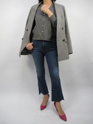 定番のデニム×ジャケットのコーディネートは女性のかっこいいの鉄板。今回は格子柄のグレンチェックを合わせました。インナーは少し暗めのカーディガンをチョイス。デニムは裾が切りっぱなしのデニムを合わせました!
