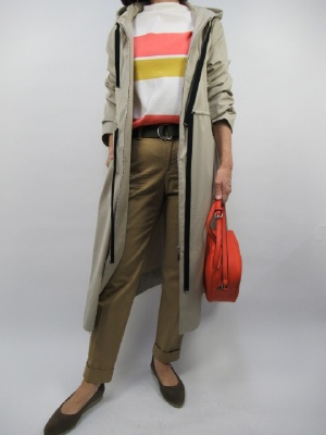 クチュームのスプリングコートは丈が長めのデザイン。フード襟でカッコよさと可愛らしさを兼ねそろえています。アウターに合わせたのにインマーゴの春ニット。ピンクとイエローの色のバランスが程よくパンツともピッタリと合います!