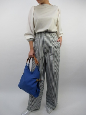 ハイウエストのバギーパンツはしっかりした生地なので足のラインもとてもきれいです。トップスにスポーティテイストのカットソーをプラス。袖はシフォンなのでカジュアルな中にちょっと甘い印象を加えて!
