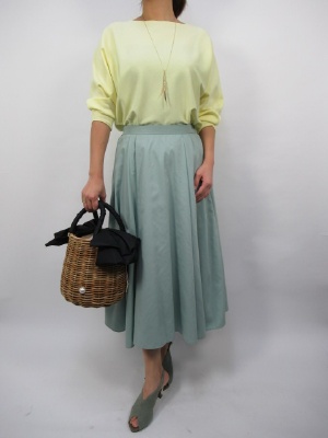 春はお洒落を楽しみたくなる季節。いつものコーデも色をキレイ色に変えるだけで気分もあげあげ。淡い色のミントグリーンは薄い黄色がよく似合う。ふんわりシルエットのスカートラインがより春を誘うコーデですね!