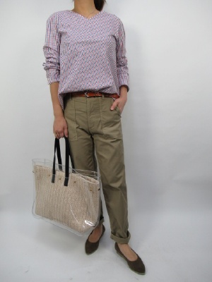 ベイカーパンツも秋から引き続き人気が高いパンツです。緩細の程よいシルエットが足長効果をもたらせてくれます。トップスは少し遊んでチェック柄のブラウスをチョイスしました!