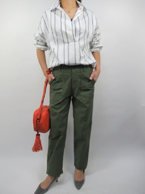 流行のベイカーパンツはさらっとシャツで合わせるのがいい。ざっくり感デザインが体のラインを拾わず綺麗に着こなすことができる。少し襟を立ててカッコよく着るといいですね!