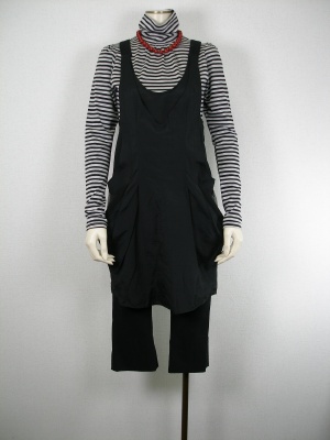 個性的なデザインのワンピースは、モノトーンでまとめるのが大人っぽい。色をプラスするなら小物で!スタイリッシュ度90%、アクティブ度10%。