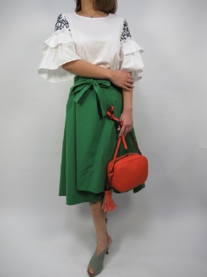 エレガントなコーデにリボンスカートは華やかな印象を作ってくれる。ブラウスは白でグリーン色を引き立たせるとオシャレにまとまる。ブラウスの袖に刺繍のポイントがある一着で春のコーデがよりエレガントになる!