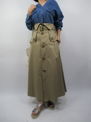 パシオーネのトレンチ風マキシスカートはとてもきれいなデザイン。少しスカート丈は長めに作ってあります。ハイウエストではいていただくのでトップスはすべてインして着こなすと足長効果絶大です。今回はざっくりしたダンガリーのシャツを合わせました。ノーカラーで首元をすっきりさせました!