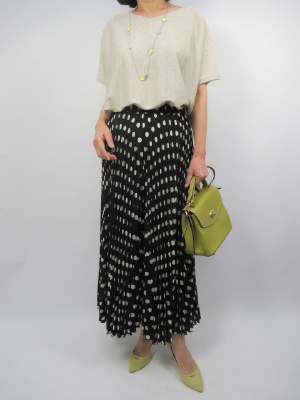 ドット柄でプリーツになったスカーチョです。甘口スタイルでラメニットを組み合わせてみました。春風に爽やかに揺れるスカーチョはお出かけにもとても便利。大きめのバッグでポイントをつけました!