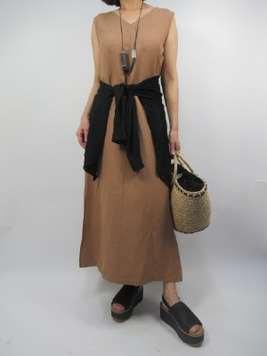 麻混のシンプルなデザインのワンピースはカジュアルシーンに良く合います。カーデを羽織ったり腰に巻いたりアレンジしてコーデしても楽しい。サンダル、バッグ、帽子・・・。小物もオフスタイルにこだわってみました!