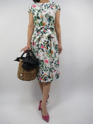 花柄のとてもキュートなセットアップです。甘口のブラウスとAラインのふんわりスカートでワンピースのような一着です。柄の中の一色を取ってパンプスにリンクしてパンツのエレガンススタイルに着まわしてもいいですね!