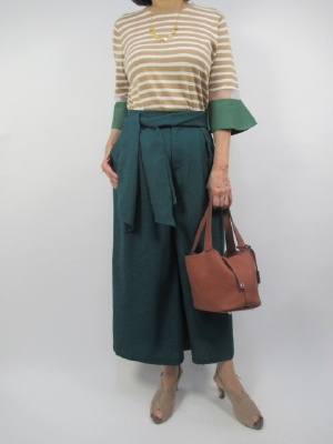 深いグリーン色のパンツは大きなリボンが特徴。甘さが出てしまうデザインですのでトップスにボーダーを持ってきてカジュアルミックスにしてみました!