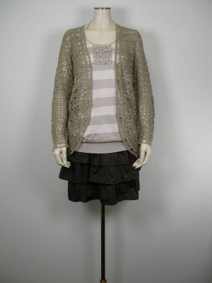 クロシェのロングカーディは夏に向けて一枚は欲しいアイテム。ボーダー柄も胸元のワンポイントがキラキラとお洒落なものを選んで。スカートを今日のトレンドミニ+ティアード。元気VERY世代に・・。フェミニン度80%、アクティブ度20%。