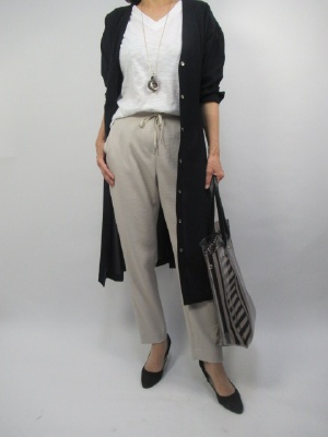 とろみのある生地が特徴のロングワンピを羽織りとして活用する。ティーパードパンツのシンプルコーデにさりげなく羽織る。今年風のスタイリング!