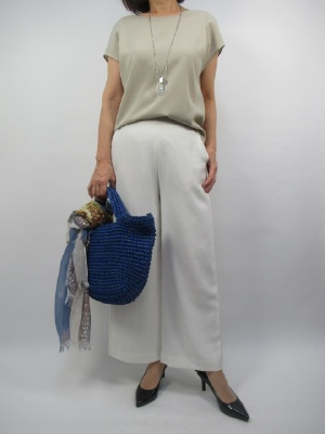 素材が同じで上下にセットアップが完成するブラウスとパンツ。今回はあえて色をはずしてグラデーションで着こなしてみました。ベーシックなデザインでシンプルコーデの好きでたまらない人の為の一着ですね!