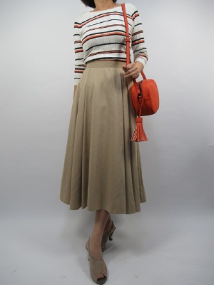 やっぱりふんわりしたボリュームスカートは可愛らしさが保たれて優しいスタイリングが完成する。ボーダーのニットをさらっと合わせるだけでデイリーファッションもちょっとお洒落なカーデになる。白地にオレンジとネイビーラインが効いています!