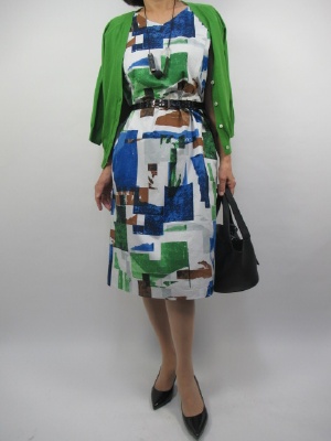 ストンとしたシルエットが特徴のワンピースは色使いがオシャレ。素材は綿ですがお出かけ使用でこれからの季節にピッタリの一着。中の一色をカーデにリンクして大人のお出かけコーデの完成です!