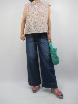 ボトムスにボリュームをつけるとトップスは軽めが良い。小花柄のキュートなデザインでまとめてみました。GWのアウトドアをおしゃれに演出してくれるコーデです!