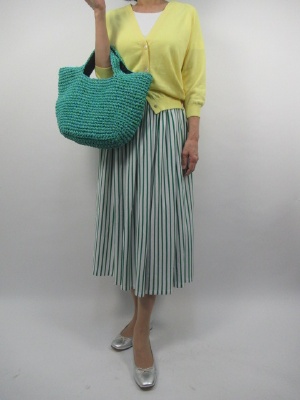 黄色のキレイ色をグリーン系のボトムスに合わせてフェミニンなコーデにしてみました。スカートの生地はカットソーでおウチ洗いもOKなんです。着心地もよくカーデと合わせてふんわりフェミニンスタイルの完成!