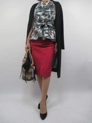 夏を感じるボタニカル柄のブラウス。セットでスカートもあるのですが、あえて明るめのタイトスカートでオシャレなコーデにしてみました。ベーシックな黒の羽織りがあれば申し分ない!