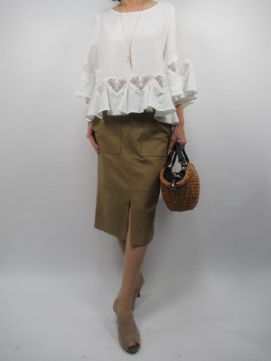 ふんわり袖のトップスはどうしても甘くなりすぎてボトムスもボリュームを合わせてしまいがち。しかしちょっと目線を変えてタイトスカートにするだけですっきりした清潔感あふれるスタイルになります!