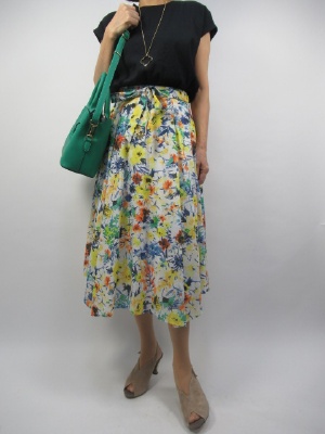 黄色がメインのキレイなお洒落な花柄スカート。とてもフェミニンな一枚。華やかすぎる柄なのでトップスをネイビーで引き締めました。するとすっきりまとまりますね!