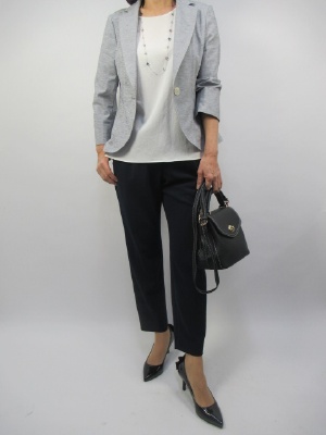 テーラードジャケットもこのくらいコンパクトなタイプはすっきり見えてスカート、パンツどちらでも使える。シャープなパンツスタイル派の辛口コーデに一枚プラスする夏のジャケット。手洗いOKなのも嬉しい一枚!