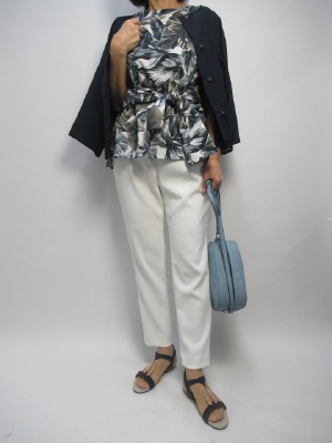 きれい目の白いパンツを一本持っておくと何かと便利。ノースリーブのリボンブラウスでオシャレに。濃紺の薄手ジャケットは肩にのせコーデにして、大人の白パンツコーデを仕上げました!