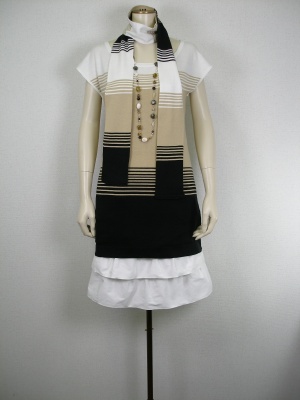 ストール付ニットチュニック。ティアードスカートの白を重ねてフェミニンに。白とベージュの優しい色がオシャレですね!フェミニン度100%。