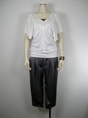 ゆるトップスに光沢パンツ、個性的なアイテムどうしでも、上品カラーでまとめれば程良く落ち着きます!エレガンス度70%、スタイリッシュ度30%。