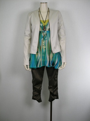 シフォンのチュニック、シャーリングのパンツ・・。流行りのアイテムもジャケットを羽織れば通勤OK!スタイリッシュ度90%、エレガンス度10%。