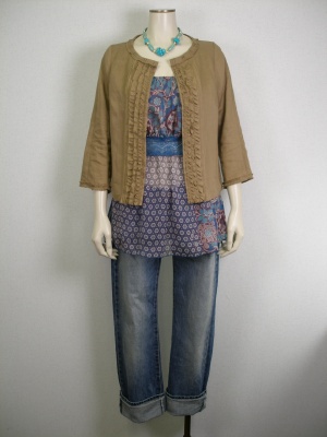 ボーイフレンドデニムにはフェミニンなトップスがお似合いです。カジュアルですが、誰からも好かれる着こなし!フェミニン度70%、アクティブ度30%。