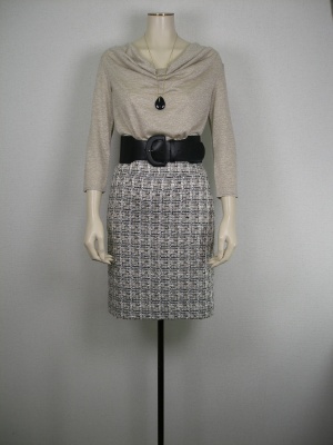 ドレープの綺麗なカットソーとツイードのスカートで、とことんエレガントに。オニキスのネックレスがアクセントに!スタイリッシュ度80%、スタイリッシュ度20%。