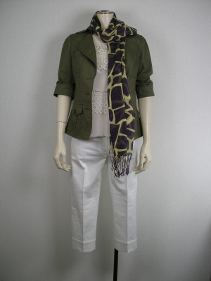 サファリテーストのジャケットには、やはり白のパンツが爽やか。ストールもキリン柄にしてみました!スタイリッシュ度100%。