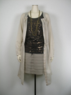薄手のロングシャツブラウスをふんわり羽織って・・。スパンコールとシフォンのスカートでシャープに全体のトーンをベージュ系にしてエレガントさを出してみました!エレガント度70%、スタイリッシュ度30%。