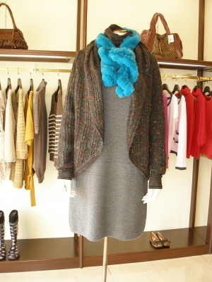 ニットワンピースはややミニ丈なのでブーツをタイツで繋いでコーディネートしてみて!フェミニン度70%、スタイリッシュ度30%
