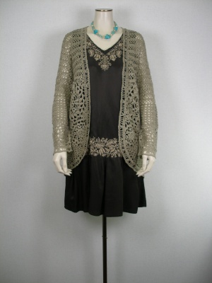 刺繍がかわいいワンピースを、カギ針ニットでナチュラルに。ターコイズ色のアクセで少しエスニック!フェミニン度80%、アクティブ度20%。