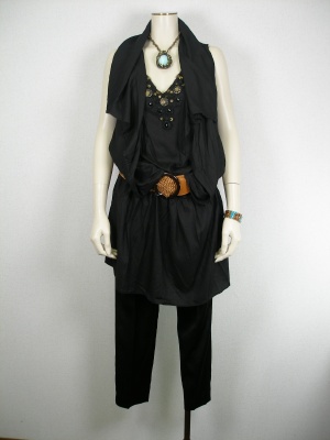 黒で全身まとめてシンプルなエレガンスを追及してみました。大ぶりのアクセをポイントに、一つだけベルトの色と靴のターコイズを遊びで効かせてみました!エレガンス度70%、スタイリッシュ度30%。