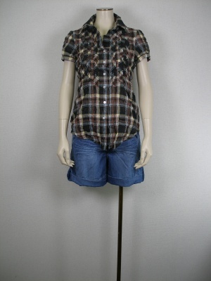 チェックのシャツとショートパンツで元気いっぱいな着こなし。パフスリーブが程良くガーリック!アクティブ度100%。
