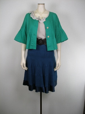袖がふんわりしたブラウスタイプのボレロがとてもフェミニン。スカートとのバランスをベルトでとってみました!フェミニン度100%。