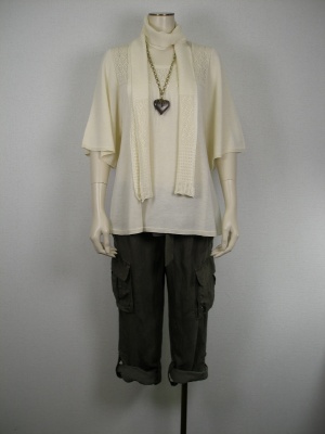 ゆるカーゴのロールアップデザインはキュートに着こなしたい。ボウタイ月のニットチュニックでカジュアルを少し甘く・・・。アクティブ度80%、フェミニン度20%。