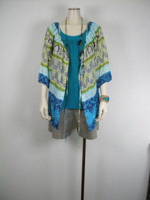 ターコイズブルーが綺麗なエスニック柄ブラウスを前を開けてサラッと羽織りました。ショートパンツで軽快に!アクティブ度90%、フェミニン度10%。