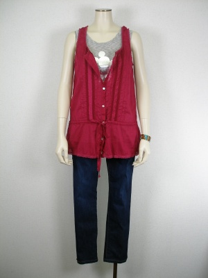 ブラウスのボタンを少し開けるとインナーのミッキーマウスがチラリ。濃い目のチェリーレッドとノンウォッシュデニムで着せ痩せ効果も!アクティブ度100%。