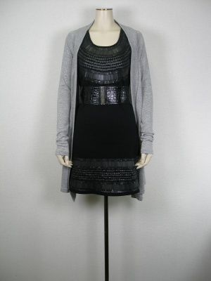 マットなスパンコールを贅沢に使ったカットソーワンピを太ベルトで更にカッコよく!そのタイトなシルエットと羽織ったロングカーデのゆるさのバランスが大人っぽい!エレガンス度70%、スタイリッシュ度30%。