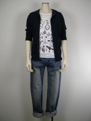 ネイビーのパーカはそれだけで夏らしい。ボーイズデニムでよりカジュアル感を出してキュートなパープルが女らしさを出してくれますね!アクティブ度100%。
